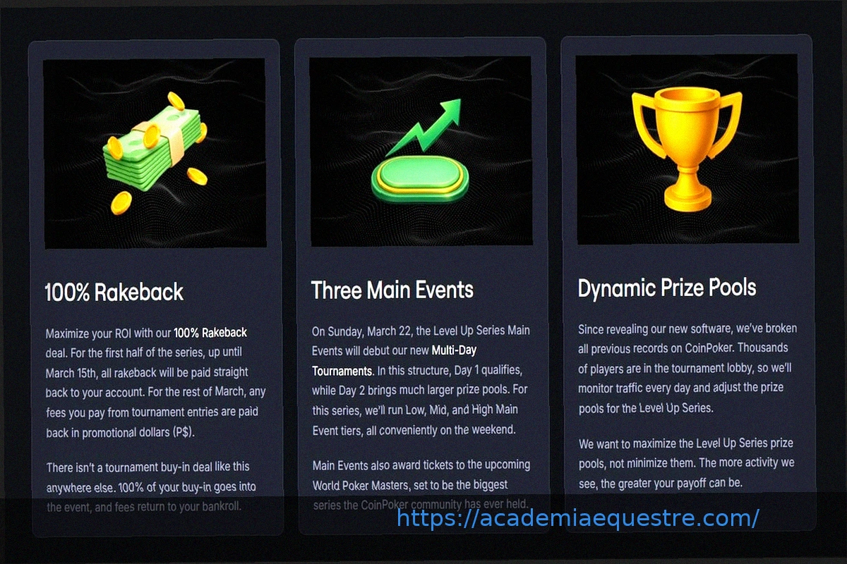 A CoinPoker revelou a Série Level Up, uma campanha de torneios de poker online com 23 dias de duração, que acontecerá de 8 a 31 de março de 2026. Esta série surge logo após a mais substancial atualização de software da plataforma até o momento, lançada em 2 de março, e integra uma ampla campanha de 100% de rakeback que durará o mês inteiro, já causando grande entusiasmo na comunidade de poker online. Todos os jogadores registrados na CoinPoker, incluindo os que se juntaram à plataforma em março, são elegíveis para participar, tornando esta uma das promoções de maior valor e mais acessíveis já realizadas pelo site.